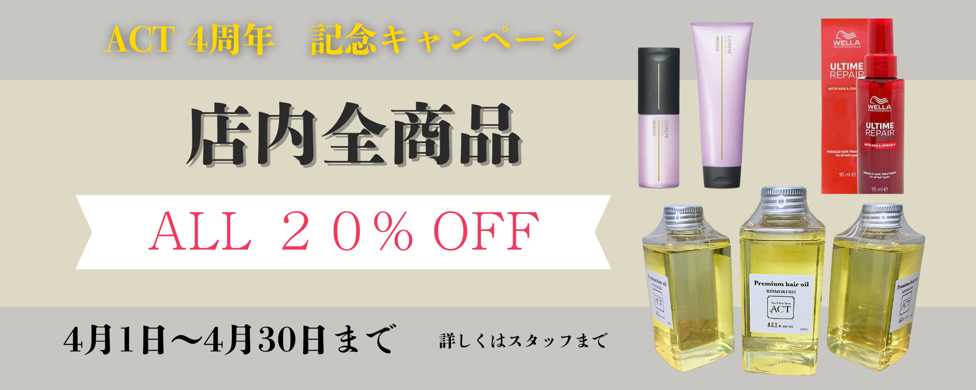 おかげさまでACTは4周年を迎えることができました😌 . 日頃よりご来店いただいている皆様に 心より感謝申し上げます🥲 . ささやかではありますが感謝の気持ちを込めて 4月1日〜31日まで店内商品を全品20%オフで ご案内しております( ^∀^)♪ . . 気になっていた商品やこれからの季節におすすめのケアアイテムなど、この機会にぜひお試しください㊗️㊗️ . 今後ともACTをよろしくお願いいたします。